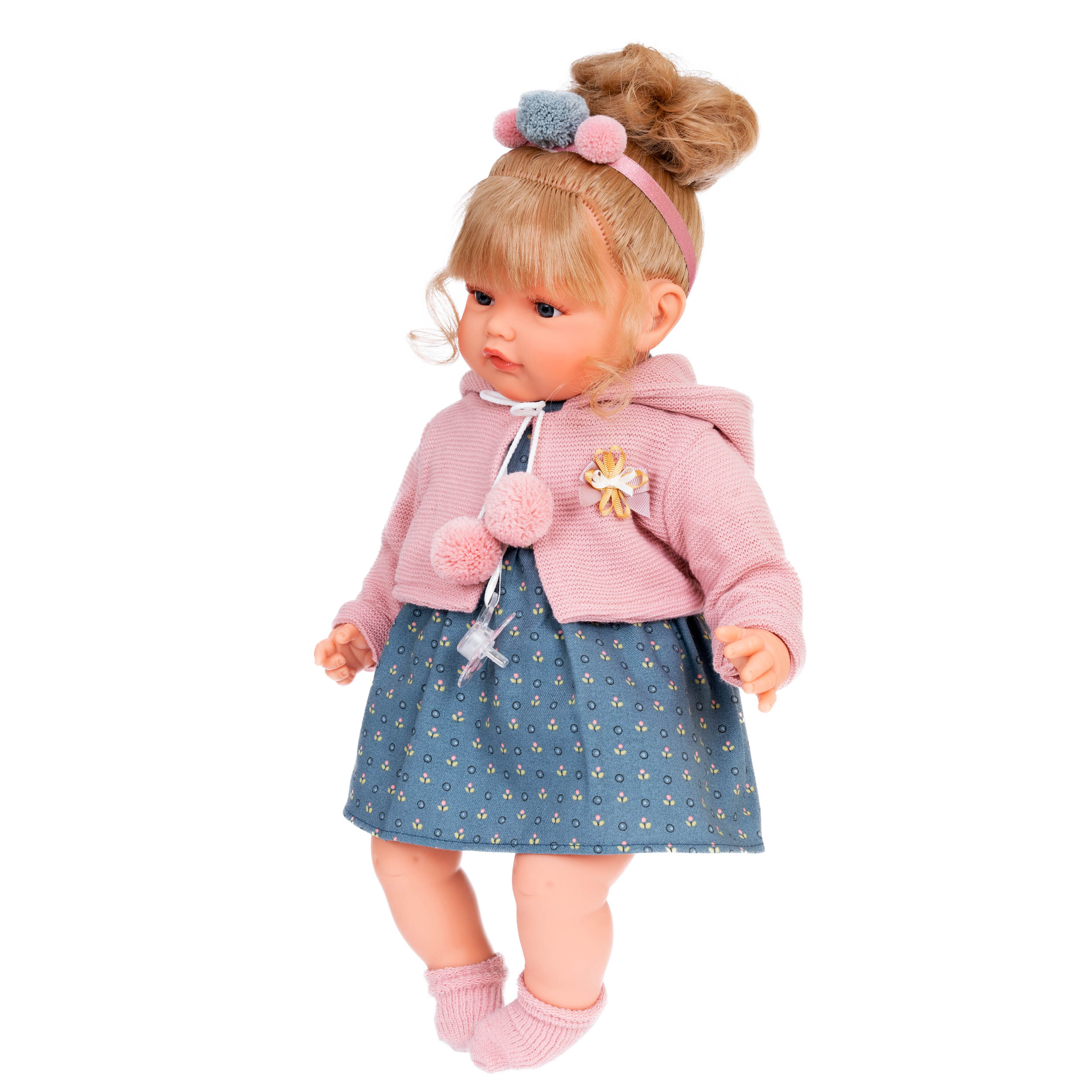 КУКЛА ОЗВУЧЕНА: выньте соску - кукла заплачет, вставьте соску в рот - кукла замолчит. Теплый наряд Лорены из органического хлопка создан специально для неё испанскими дизайнерами и включает в себя платьице, теплую вязанную куртку с помпонами и носочки. На голове - очаровательный ободок с помпонами.