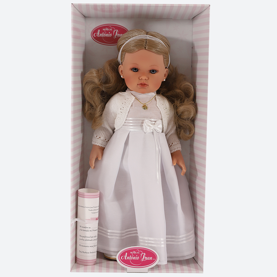 Кукла Айза - очаровательная кукла-девочка размером 45 см создана в Испании мастерами-кукольниками фабрики Мунекас Антонио Хуан. У Айзы грациозная стройная фигурка, симпатичное личико и выразительные голубые глаза, обрамлённые длинными ресницами. Кукла с подвижными ручками и ножками полностью изготовлена из высококачественного винила. Светлые густые шелковистые волосы легко расчесывать и делать прически. Волосы украшены кружевной лентой. Куклу также украшают медальон, сережки и сумочка. Айза одета в роскошное длинное белое платье, традиционное для церемонии принятия Первого причастия в Испании. Образ завершают ажурное болеро и туфельки.