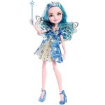 Начнём с очаровательной Эшлин. Волосы светло-коричневые на голове розовый ободок. Платье у неё не обычное, прозрачные рукава фонарики немного бирюзового цвета, само платье голубое с принтом розовых цветов, поверх него вставка из бирюзового атласа, а ниже талии прозрачная вставка с золотым принтом. Кукла имеет ожерелье и серёжки золотого цвета. Обувь у Эшлин прозрачная бирюзового цвета. Сумка в виде часов прибавляет ей стиля её матери или Золушки, эти золотые часики напоминают ей что нельзя проводить время с Хантером в людном месте.
