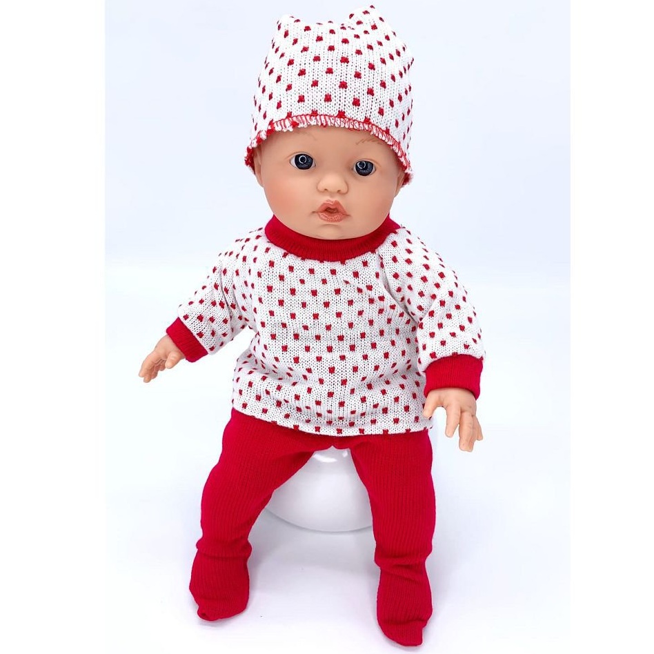 Одежда - красные ползунки; белая с красным рисунком кофточка, с длинным рукавом; белая с красным рисунком шапочка.