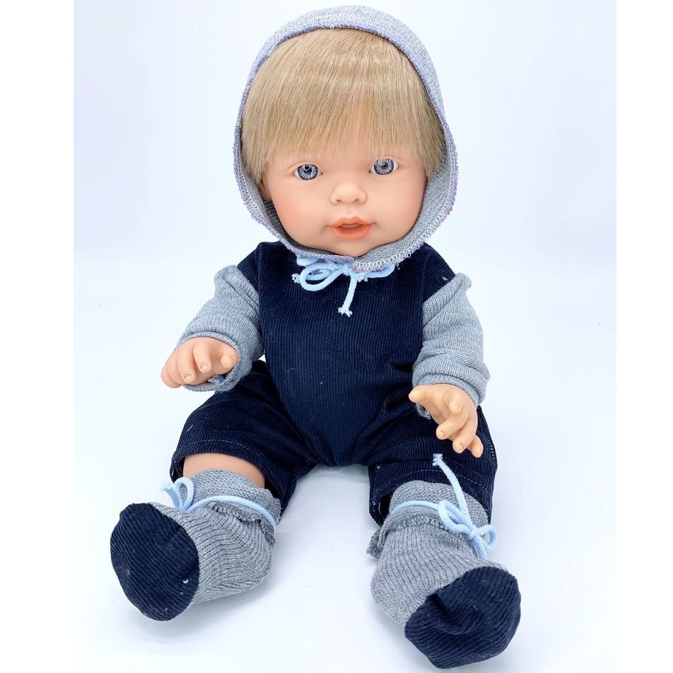 Одежда - сине-серый комбинезон; серая шапочка; серые носочки.