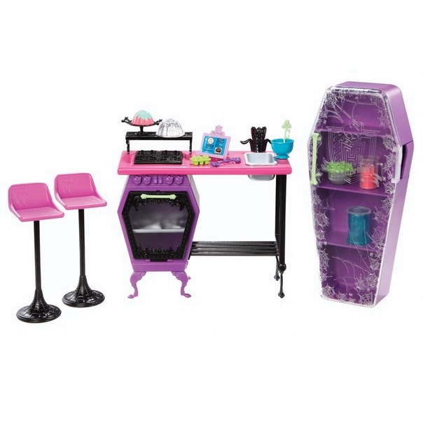 К этому плейсету не идут куклы, он состоит из уникального кухонного набора для твоих талантливых кукол, которые могут приготовить множество вкусняшек на этой кухне. Помимо столиков и стульев в плейсете есть шикарный большой шкаф фиолетового цвета с прозрачной дверкой, покрытой узором из паутины, имеющий фирменный логотип Монстр Хай и ручку в виде салатовой косточки. В шкафчике четыре полки и две баночки с ингредиентами для занятия. Основной стол-парта соединен с фиолетовой печкой, дверка которой открывается, чтобы твоя куколка поместила в духовку приготовленную вкусняшку. На парте есть подставка для ножек, плита с кастрюлькой, откуда уже убегает зеленое варево, а так же, раковина и кран в монструозном оформлении. На полочке парты стоит книга с рецептами, плошка с двумя ложечками зеленого и фиолетового цветов, а также формочка для желе и уже готовое желе, которое приготовила для тебя Эбби. К парте прилагается два стула с розовой основой и черной стойкой, ведь нельзя же работать в одиночку?