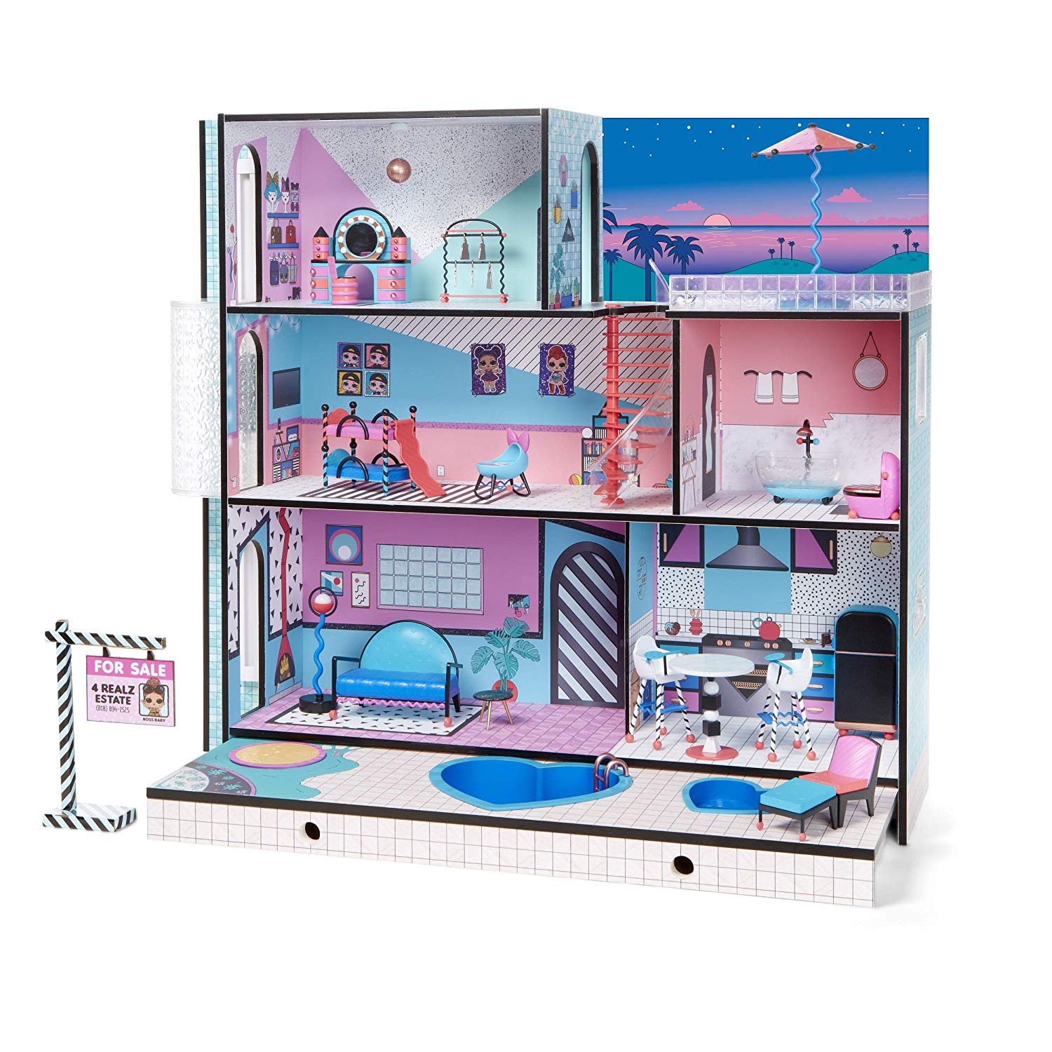 Перед вами просто гигантский дом для кукол! В нем три этажа, шесть комнат, двор с двумя настоящими бассейнами и песочницей, крыша с зоной отдыха, а также вертолетная площадка! Дом сделан из настоящего дерева, что говорит о его прочности и качестве!