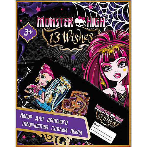 В наборе: пенал-косметичка с нанесенным контуром, стразы, краски для ткани - 6 цветов (красный, синий, жёлтый, зеленый, белый, голубой), кисть, инструкция.