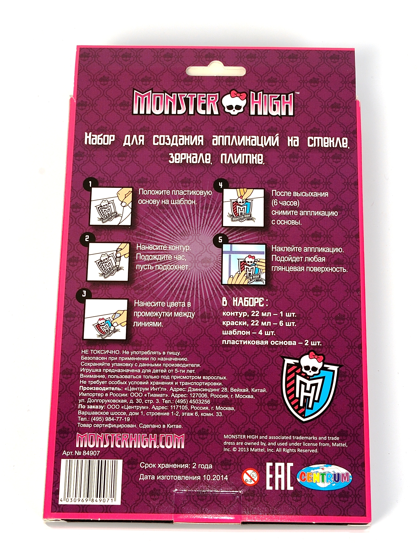 Набор витражных красок Мonster high. Состав: витражные краски 6 цв. Х 22 мл, черный контур 22 мл, шаблон-трафарет 4 шт., пленка-основа.
