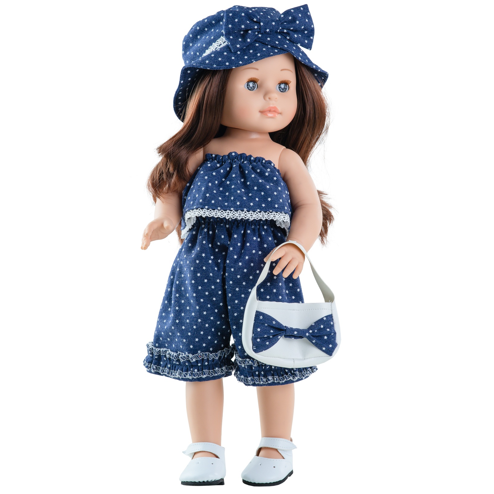 Милая девочка Эмили, одета в летний джинсовый комбинезон, панама в тон и белые сандалии. В руках белая сумочка с бантом. Голубоглазая брюнетка завораживает своим неповторимым дизайном лица и шикарными волосами. Волосы красиво блестят и легко расчесываются. Кукла изготовлена из качественного и экологически чистого винила. Ножки, ручки, голова подвижны. Куколка размером 42 см, подходит для детей от 3х лет. Материал: винил, нейлон, текстиль. В комплекте: кукла, одежда.
